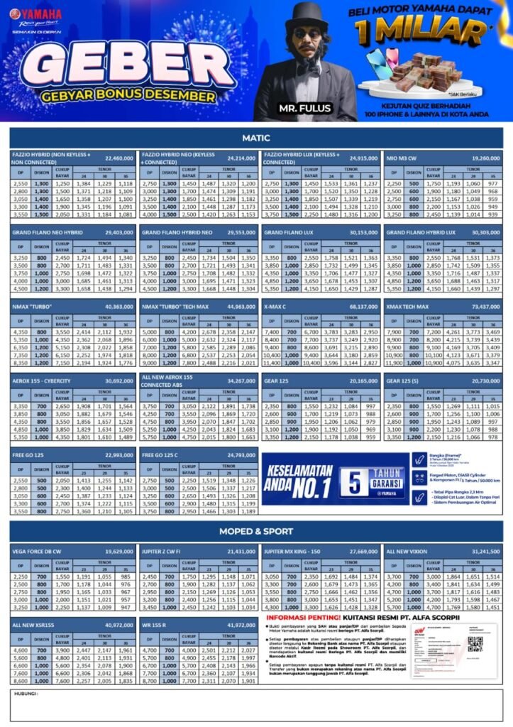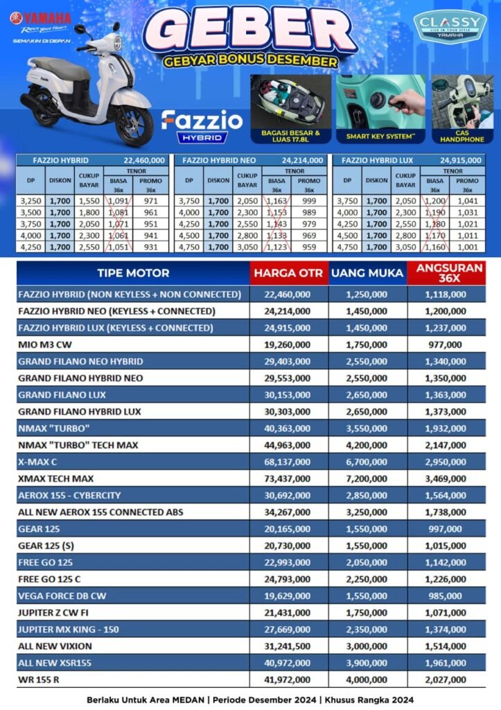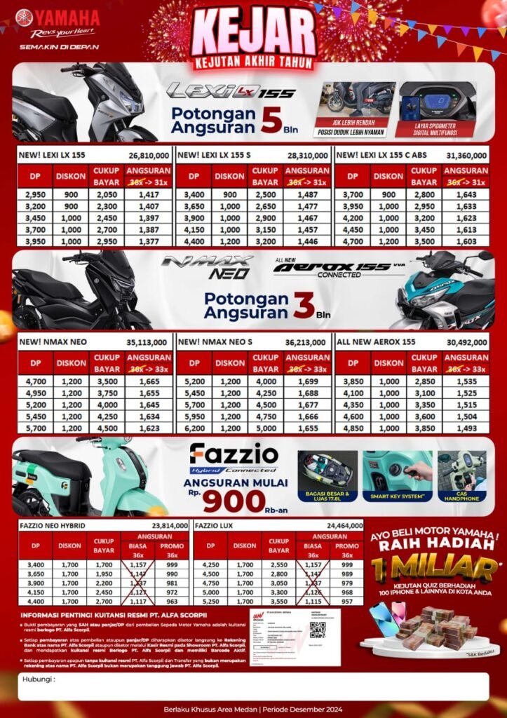 Pastikan Anda telah mendapat informasi jelas mengenai spesifikasi dan harga sepeda motor yang terbaru. Sales kami adalah sales Motor Yamaha Medan rekomendasi untuk anda yang mau tahu info promo,cashback,serta diskon untuk pembelian motor Yamaha, alamat dealer yamaha kota medan,bengkel resmi yamaha kota medan dan showroom yamaha kota medan. Sebelum membeli tanyakan terlebih dahulu syarat dan prosedur untuk membeli secara tunai ataupun kredit ke Sales Yamaha Medan. Anda juga dapat bertanya tentang informasi alamat dan kontak dealer ataupun showroom dan outlet resmi motor Yamaha Kota Medan terdekat dari domisili anda.